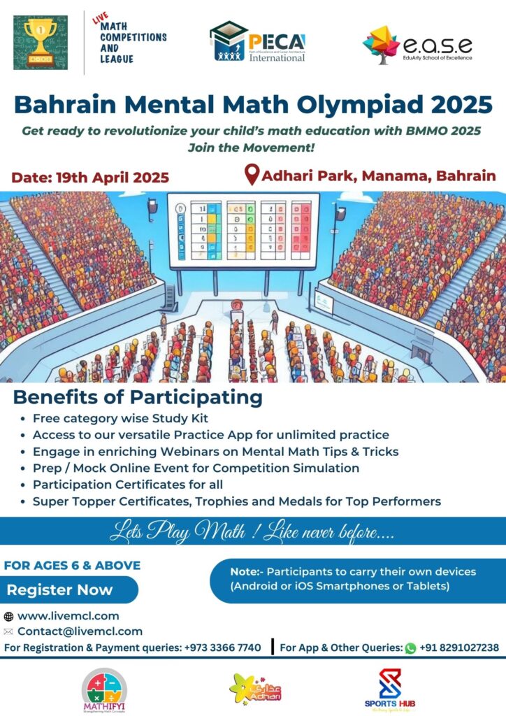 Building on the success of our flagship events, Mental Math World Cup (MMWC) and Global Mental Math Olympiad (GMMO), Live Math Competitions and League is thrilled to introduce the 1st edition of the Bahrain Mental Math Olympiad (BMMO 2025). This prestigious event will take place at Adhari Park, Manama, Bahrain, on 19th April 2025, and will now join our marquee annual events alongside MMWC and GMMO.